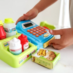 Børn kan “bippe” kiks og andre produkter ligesom ved kassen i en butik. Realistiske lyde understøtter fantasien og trækker dem ind i legen.