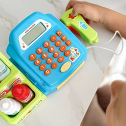 Sjovt og lærerigt børnekasseapparat fra WOOPIE med udtræksskuffe, fungerende lommeregner og scanner med lyde. Ideel til butiksleg, udvikling af kommunikation, grundlæggende matematik og finmotorik. Børn kan betale med mønter, sedler eller betalingskort og placere varer på den praktiske hylde.