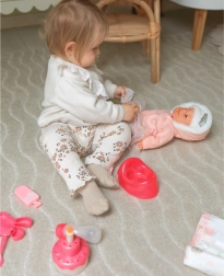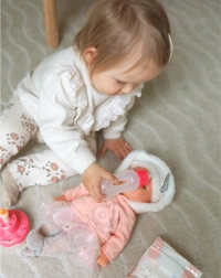 Dukken kan drikke af sutteflasken, og du kan fodre hende med den medfølgende skål. Rollespil som forældre fremmer empati og ansvarlighed.