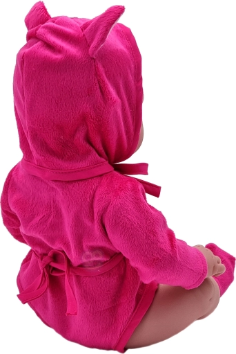 Dukken har et sødt lyserødt sæt med bjørnedesign og hætte, som giver et legende og attraktivt udseende.