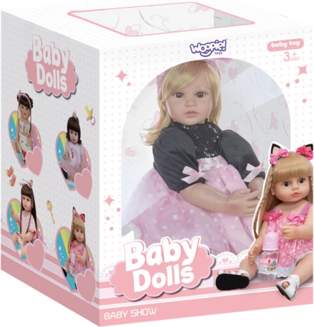 Den søde interaktive dukke WOOPIE ROYAL Eliana i pink‑sort kjole imponerer med et realistisk udseende, blødt plys-krop og lange, skinnende hår perfekte til at frisere. Hun reagerer på stimuli, kan grine, græde, og når hun lægges på ryggen, falder hun i søvn og småsnorker. Det aftagelige tøj kan vaskes i maskine, og sættet indeholder flaske, sut, ble og en plyskammerat – perfekt til at udvikle børns empati og omsorgsevner fra 3 år.