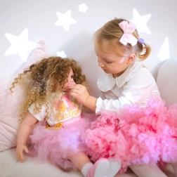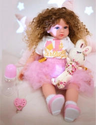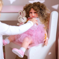 Fine øjenvipper, markante øjne og langt hår til at frisere understøtter kreativiteten. Den plysset mave og bløde silikonelemmer giver dukken en naturlig fornemmelse.