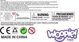 Hun griner, når hun vugges, laver glædeslyde ved kram, kan græde, og når hun lægges på ryggen, snorker hun. Reagerer også, når hun lægges på maven. Strømforsyning 3× AA (medfølger ikke).