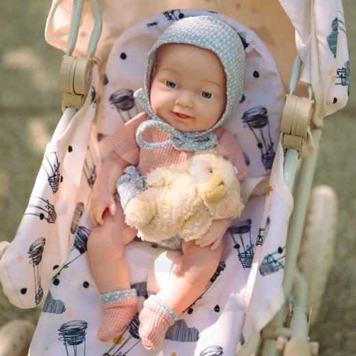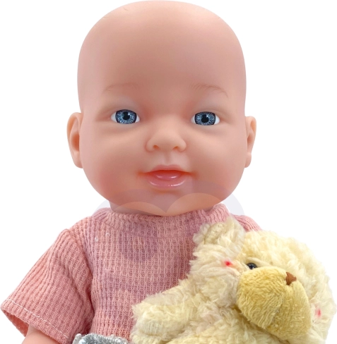 Sættet indeholder alt, hvad små omsorgsgivere behøver: påklædt dukke, sut, bamse, sutteflaske og spisesæt (tallerken, gaffel, ske), suppleret med to flasker “kosmetik” til bade- og plejescenarier. Dukken har bløde, gummiagtige bevægelige lemmer og en plastkrop uden plysfyld.