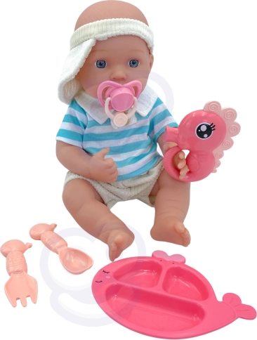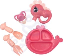Sættet indeholder opdelt tallerken, bestik, sut med snor og andet tilbehør, der forvandler legen til ægte omsorg.