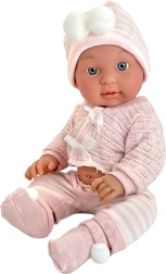 Den lyserøde strikkede cardigan, stribede trusser og huen med kvaster er behagelige at røre ved og lette at tage af og på.