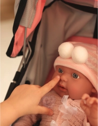 Arme og ben kan nemt placeres i forskellige positioner. Børn kan klæde dukken på, bære den, lægge den i barnevogn og lege omsorg.