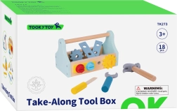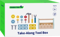 Sød træværktøjskasse fra TOOKY TOY, ideel til små håndværkere fra 3 år. Sættet indeholder 18 dele i pastelfarver – hammer, skruetrækker, skruenøgle, skruer, møtrikker, tandhjul og plader. Delene kan nemt fastgøres i hullerne i kassen, og efter leg kan de bekvemt opbevares indeni. Fremstillet af træ af høj kvalitet med giftfri farver og designet til at udvikle finmotorik, kreativitet og hånd-øje-koordination.