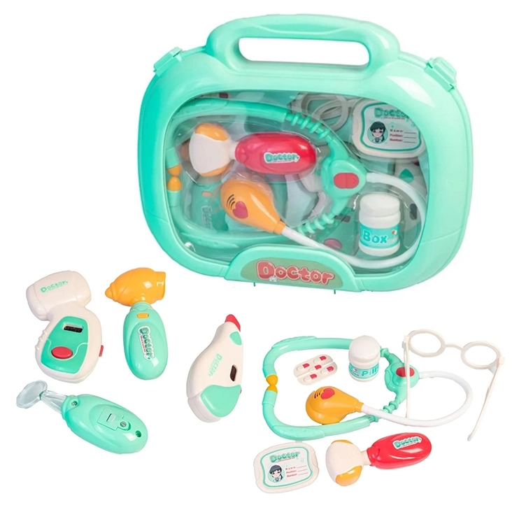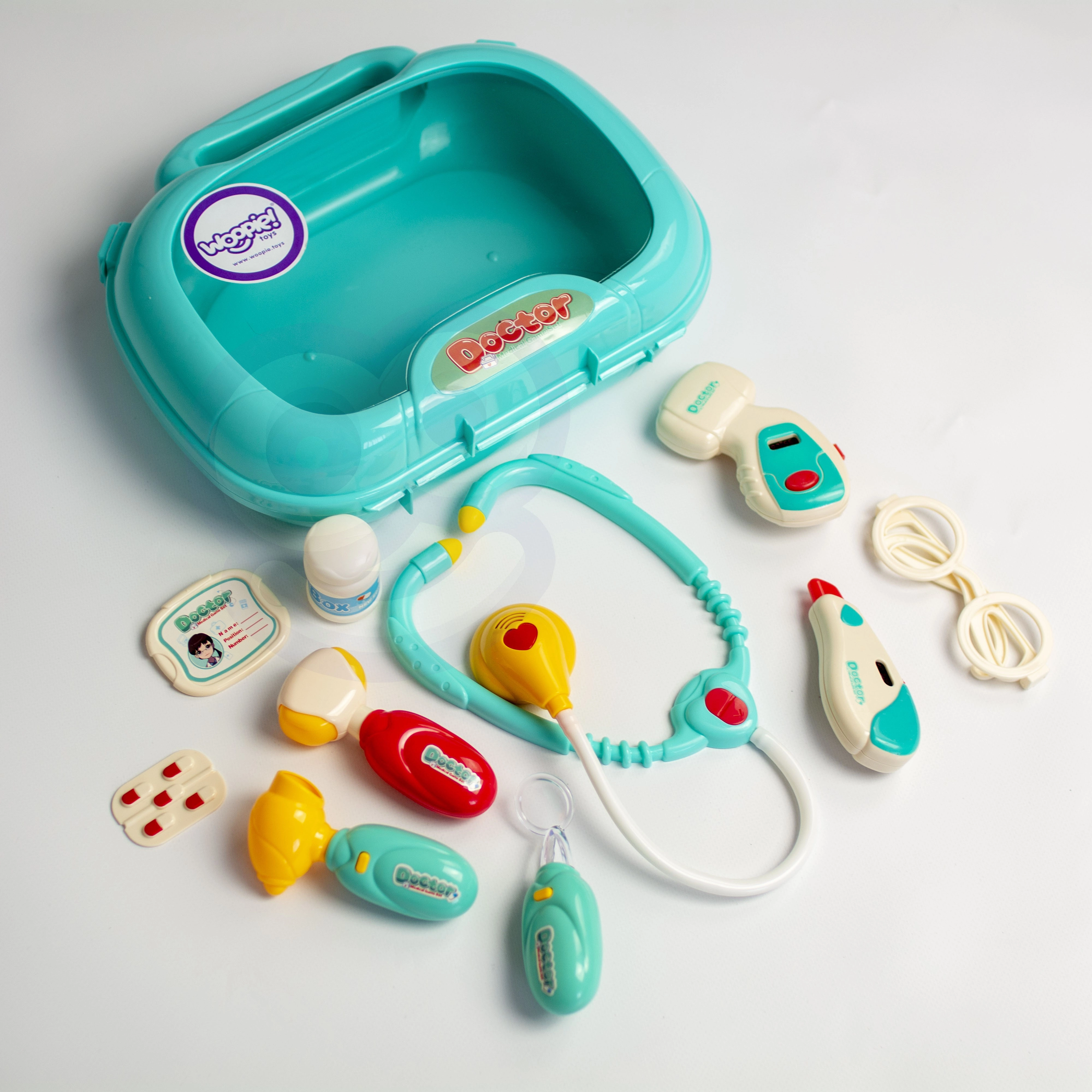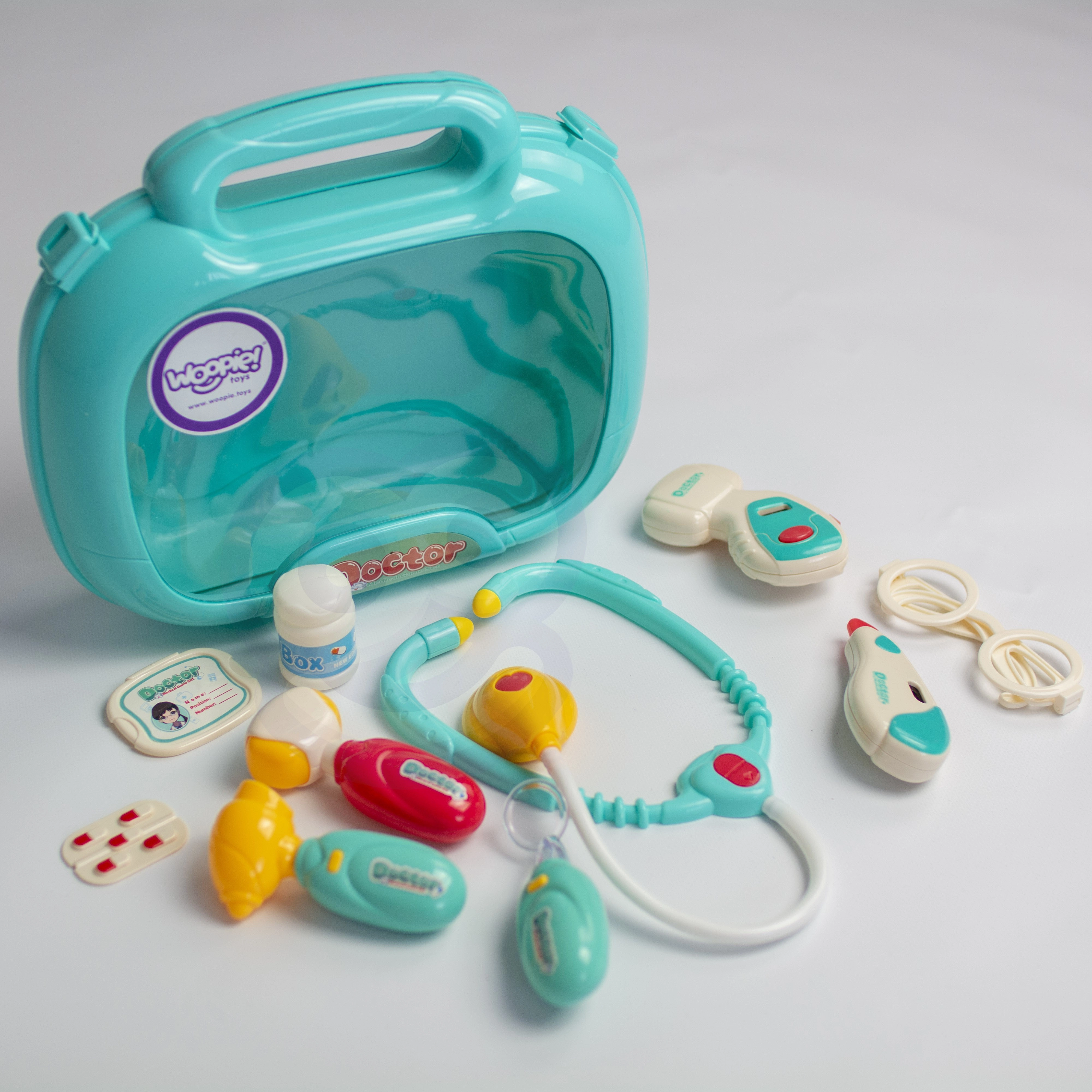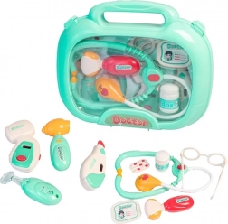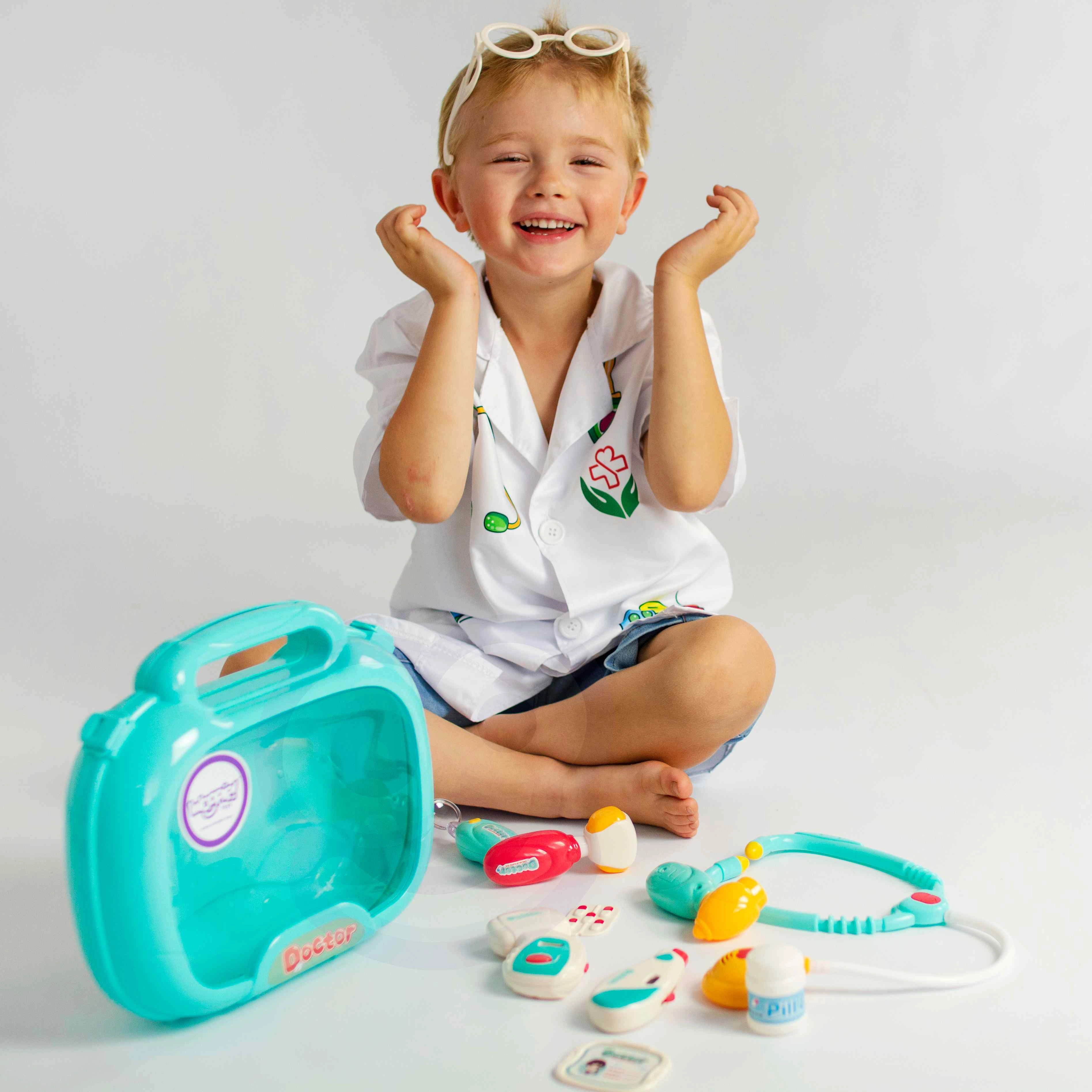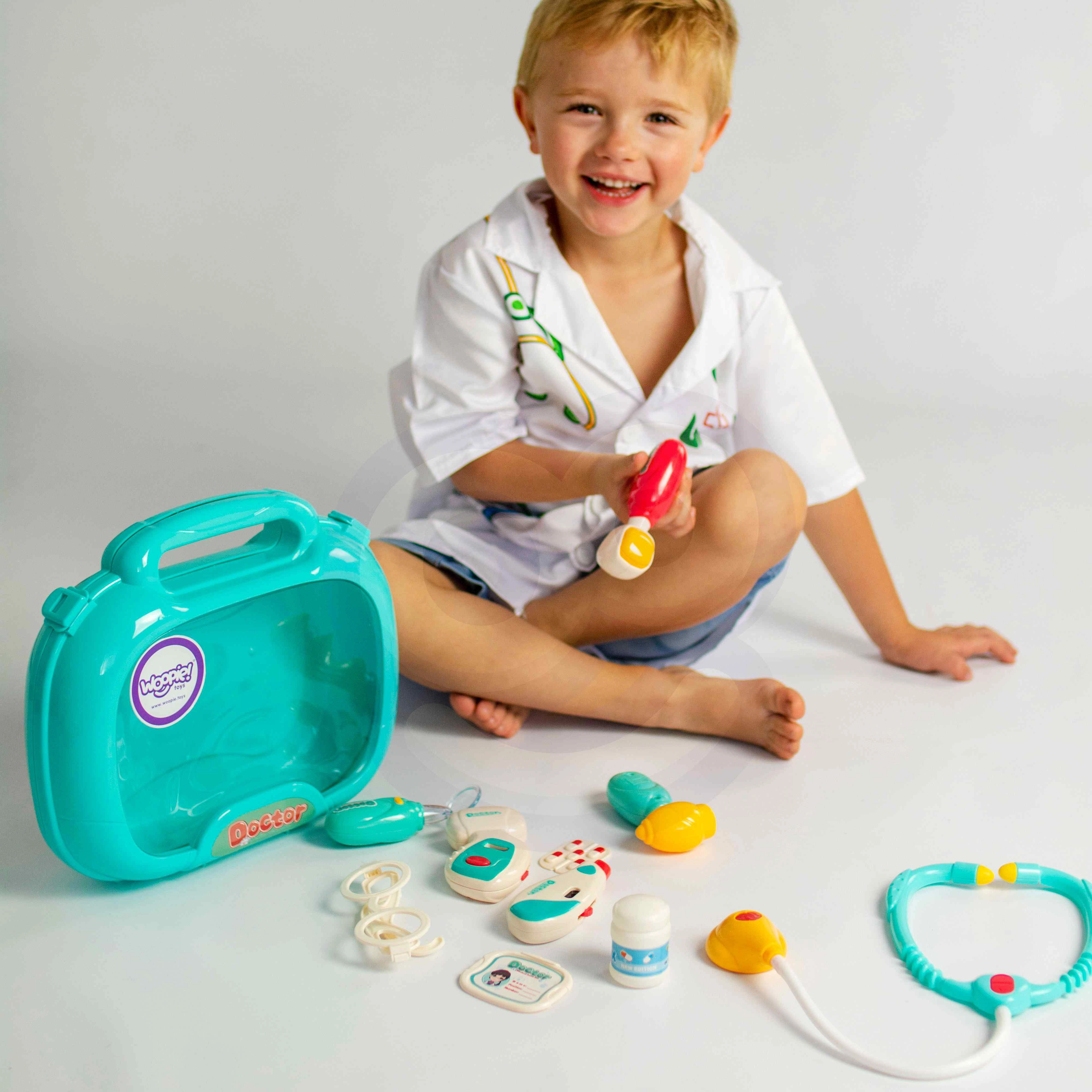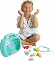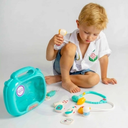 Det hele er opbevaret i en praktisk kuffert med håndtag, hvilket sikrer nem transport. Barnet kan udvikle sin fantasi og lege læge eller patient!