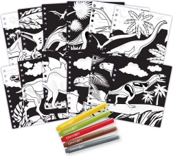 I pakken finder du alt, hvad du behøver for at komme i gang med det samme – fra fløjlsskabeloner til mini tuscher og klare vejledninger. De informative sider om dinosaurer udvider horisonterne og gør farvelægning til en sjov læringsstund.