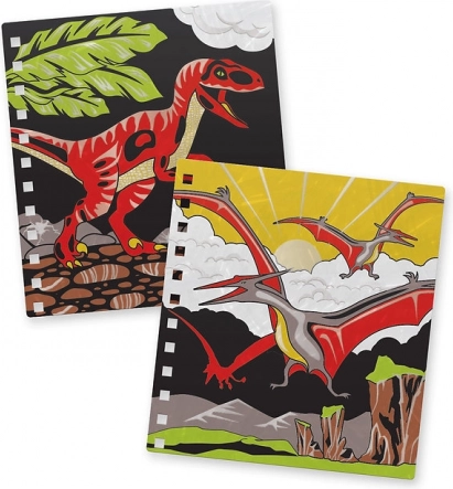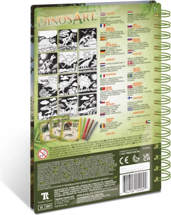 - 12 fløjls-farvelægningsplader, 5 mini tuscher, vejledninger, informative sider om dinosaurer