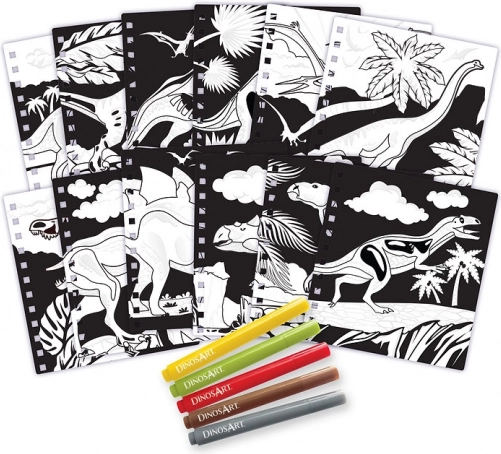 Fløjls-malerier DINOSART giver børn en sjov og lærerig oplevelse. Takket være fløjlskonturerne flyder farverne ikke ud og holder sig inden for linjerne, hvilket er perfekt til mindre børn og begyndere. Sættet forener kreativitet og lære om dinosaurer gennem leg.