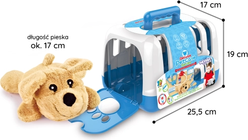 Gør jer klar til sjov leg som dyrlæge med sættet WOOPIE. Dette bærbare sæt med en plyshund, transportkasse med håndtag og tilbehør udvikler børns empati, kreativitet og ansvarlighed. Takket være de kompakte mål kan børn tage deres kæledyr med hvor som helst.