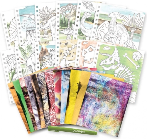 Opdag et kreativt sæt for små palæontologer: folierede malebøger med dinosaurmotiver fra DinosArt. Børn kan med en speciel pen nemt overføre skinnende folieeffekter på 12 forlæg og skabe imponerende billeder. Sættet indeholder trin-for-trin-instruktioner og spændende fakta om dinosaurer – en ideel gave til kreative børn.