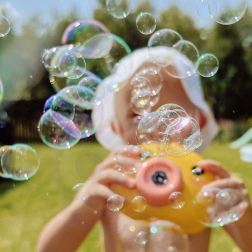 Den integrerede ventilator blæser boblerne længere væk og øger effekten. Ideel til udendørs leg i solen.