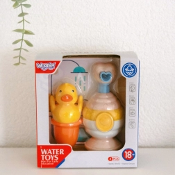 Woopie badelegetøjssættet er designet til at bringe sjov og udvikling ind i badetiden. Anden, der flyder på vandet, inspirerer til kreativ leg, og koppen til at hælde lader børn observere vandets bevægelse. Sæbedispenseren forvandler almindelig sæbe til et blødt, luftigt skum, hvilket gør vask sjovere og mere grundig.