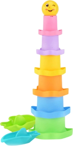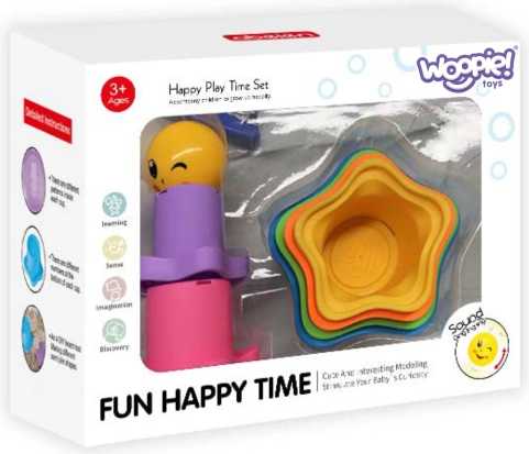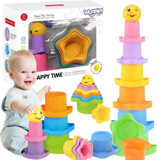 Denne sensoriske pyramide i regnbuens farver indeholder kopper i forskellige størrelser formet som stjerner samt en glad bold med print. Børn træner greb, sortering efter størrelse og logisk tænkning, mens de bygger og vælter tårne eller udforsker de enkelte dele.