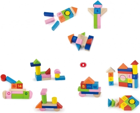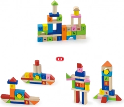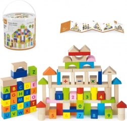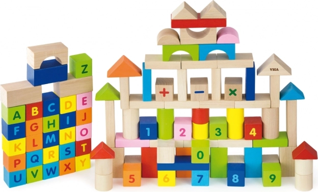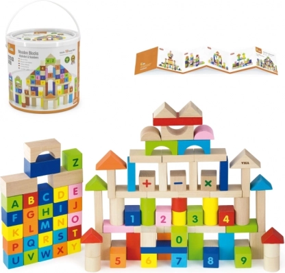 Denne farverige VIGA-samling med 100 træklodser, inspireret af MONTESSORI-principper, giver børn glæden ved at udforske bogstaver, tal og enkle regneopgaver. Med de mange former – klodser, cylindre, buer og tage – kan børn bygge byer, tårne og fantasistrukturer, mens de ubemærket øver alfabet, tal og farver.