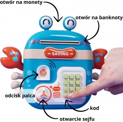 Den elektroniske safe er udstyret med et numerisk tastatur til indtastning af PIN-kode, en simuleret fingeraftrykslæser og en drejeknap til at åbne. Når man trykker på cifrene, taler den og afspiller sange på engelsk, så børnene træner både tal og lytning. Du kan til enhver tid nulstille og indstille en ny kode.