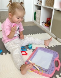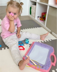 Opdag en legende vej til læring og finmotorik. Woopie magnetisk tavle lader børn sikkert øve skrivning af bogstaver og tal, prøve deres første tegninger og udtrykke deres fantasi – uden rod og uden papir. Med ét træk i skyderen slettes billedet, og sjoven kan begynde forfra.
