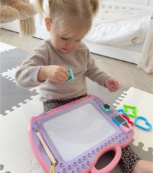 Magnetisk tegnetavle fra Woopie giver uendelig sjov for børn fra 3 år. Den understøtter skrivning, tegning og udvikling af finmotorik, fantasi og kreativitet. Med den praktiske visker-skyder kan barnet nemt lave et nyt billede på et øjeblik. Medfølger gør en magisk stylus, 4 stempler og 4 skabeloner for endnu mere varieret kreativitet, plus et behageligt bærehåndtag til transport.