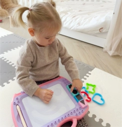 Medfølger gør en fastgjort stylus, 4 formstempler og 4 skabeloner. De understøtter præcision, fantasi og udvikling af finmotorik.
