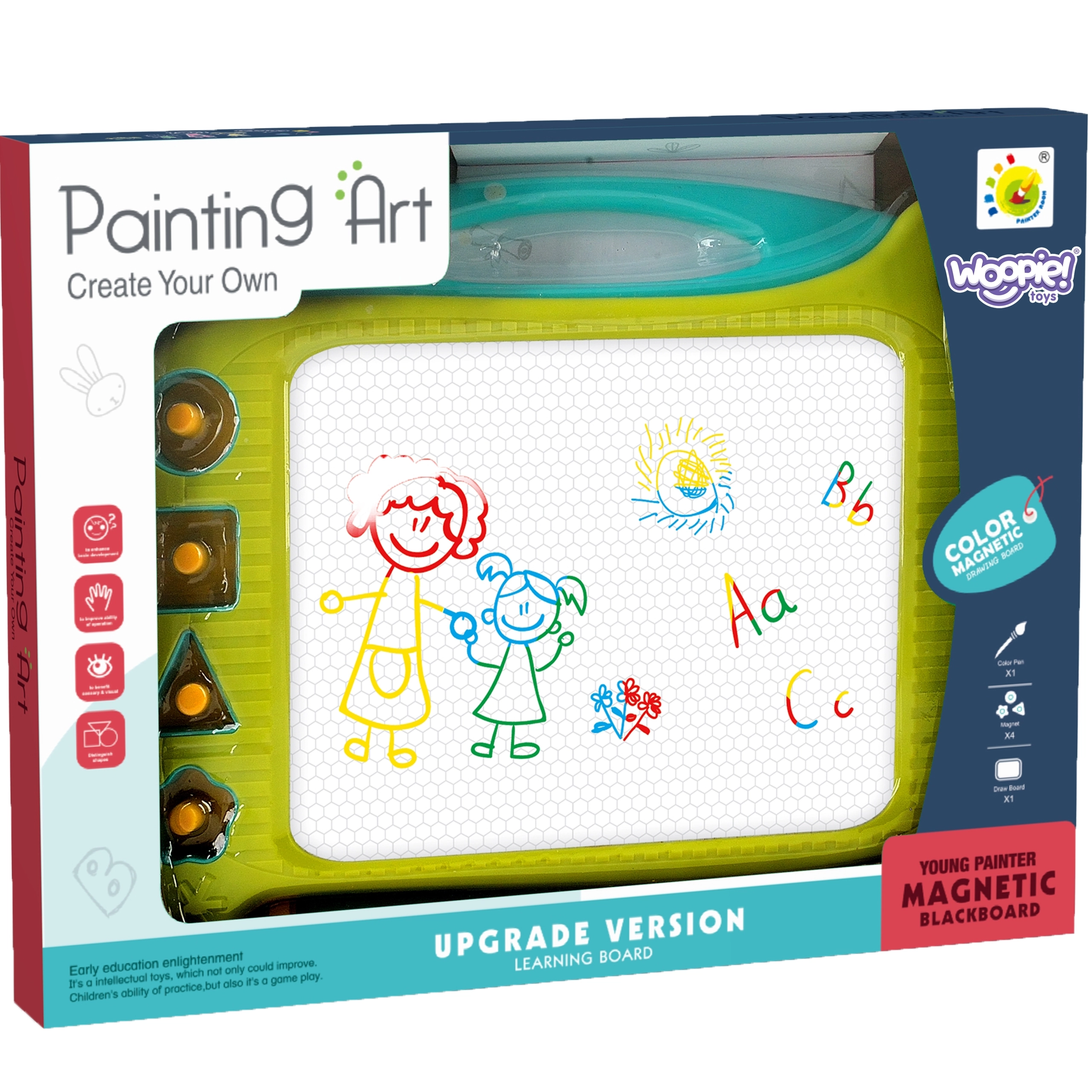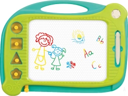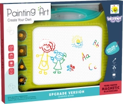 WOOPIE magnetisk tegnetavle giver masser af kreativitet og langvarig sjov! Tavlen opfordrer til skrivning og tegning. Når barnet tegner, kan det koncentrere sig og falde til ro. Tavlen gør det muligt at lave uendeligt mange billeder – træk blot i den særlige skyder, så forsvinder tegningen, og I kan begynde forfra! Sættet indeholder også en magisk pen og 4 stempler for variation. Tavlen har et praktisk håndtag for nem transport, så barnet kan tage den med overalt. Produktet understøtter udviklingen af finmotorik, fantasi og kreativitet og hjælper barnet med at udfolde sin kunstneriske side!