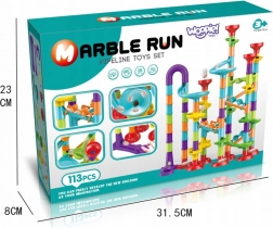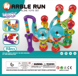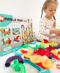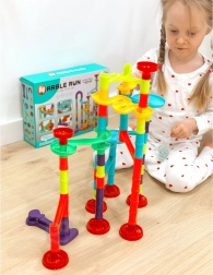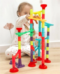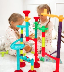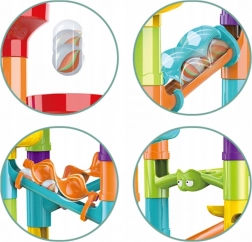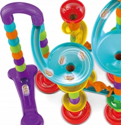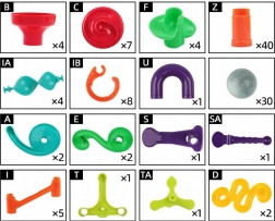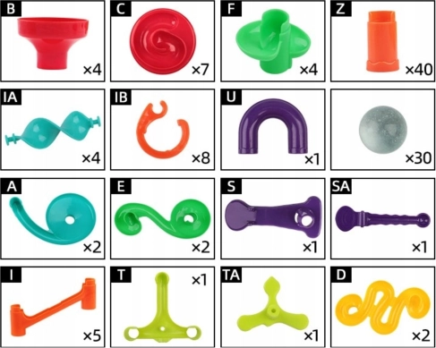 Forskellige rør, sving, spiraler, tragte og stolper gør det muligt altid at bygge en ny og underholdende kuglebane. Byg efter vejledningen eller skab dine egne fantasifulde baner.