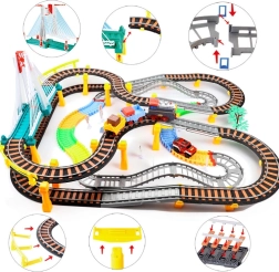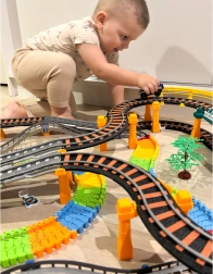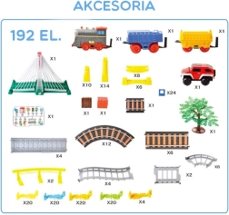 Oplev 2-i-1 sjov: en farverig elektrisk togbane med viadukt og en racerbane til bil på adskilte spor. Sættet indeholder en lokomotiv med 2 vogne, en batteridrevet bil, en lysbuebro og tilbehør. Sæt med 192 dele tilbyder realistiske togllyde, stimulerer fantasi og finmotorik og er ideelt til børn fra 6 år.