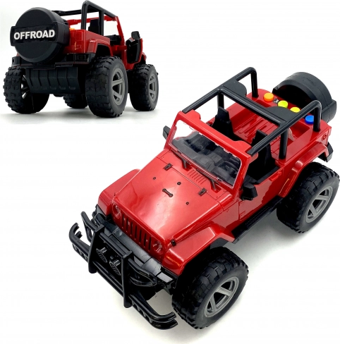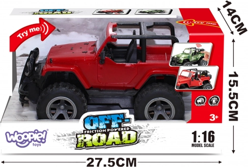 Giv børnene en actionfyldt tur med den røde terrængående jeep fra Woopie. Robust plastkonstruktion, gummislidbane på hjulene for bedre greb, lys- og lydeffekter samt friktionsdrev til kørsel efter et skub gør denne legetøjsbil til en fantastisk gave til små bilister.