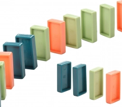 I sættet finder du 60 plast-dominobrikker i tre farver – ideelle til fantasifulde baner og effektfulde dominoreaktioner.