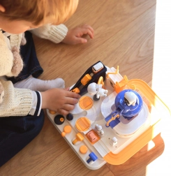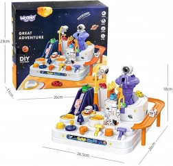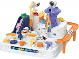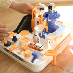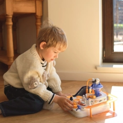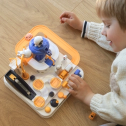 Opdag den sjove interaktive rum-bane med forhindringer, hvor børn styrer knapper og håndtag, sætter elevatorer i gang, vipper broer og flytter biler med en magnetisk raket. Uden batterier, fuld af bevægelige elementer, understøtter finmotorik, logisk tænkning og fantasi. Der medfølger 3 biler til både solo- og konkurrenceleg.