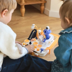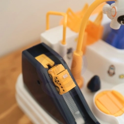 Rumstationen bliver til en actionfyldt legeplads: Børn planlægger ruten, overvinder forhindringer og styrer bilerne med knapper og kontroller langs ramper, elevatorer og drejeplatforme. Den magnetiske raket transporterer køretøjer “i luften” til vippebroen, som kan sænkes og hæves efter behov.