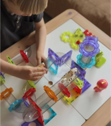 Magnetiske komponenter muliggør en let og stabil forbindelse mellem de enkelte elementer, hvilket giver børn varierede byggeoplevelser.