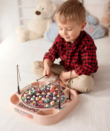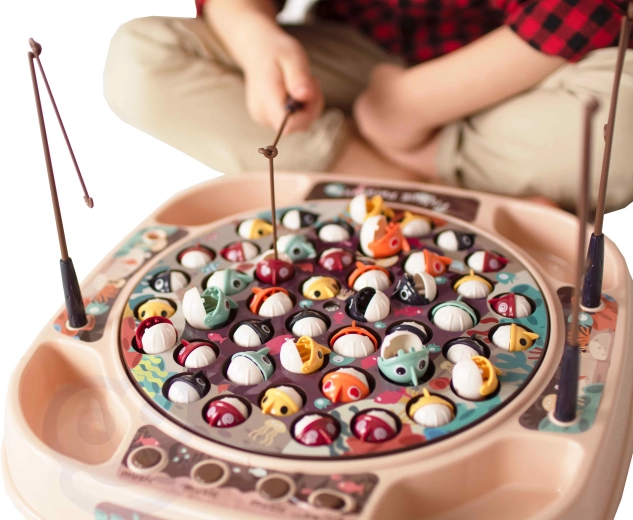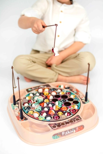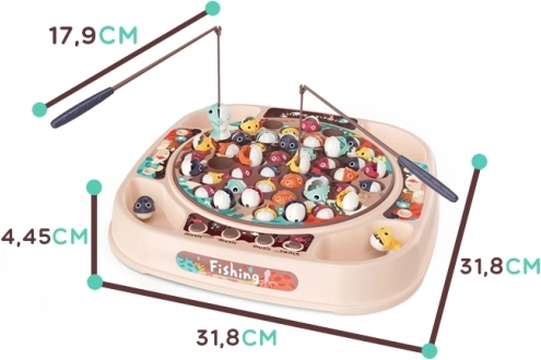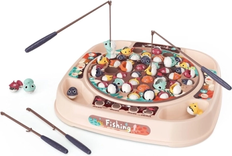 Det populære færdighedsspil fiskeri i en moderne udgave. Når spillet tændes, roterer pladen med fiskene langsomt i takt med musikken, og nogle fisk åbner munden – det er det rette øjeblik til at fange dem med stangen. De klare farver og det dynamiske forløb fanger straks børnenes opmærksomhed og styrker deres sunde konkurrenceånd.