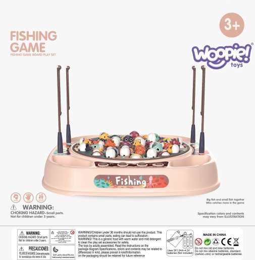 Det underholdende familiespil fra WOOPIE byder på en roterende plade med fisk, 4 fiskestænger og op til 50 dele til actionfyldt fiskeri. Børn træner reaktionsevne, hånd–øje-koordination og koncentration, mens de forsøger at fange fiskene, der åbner deres “munde”. Spillet har lydeffekter, er velegnet fra 3 år og underholder op til 4 spillere.