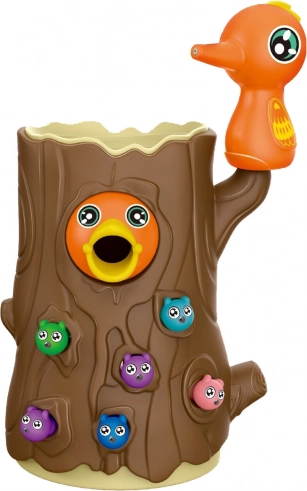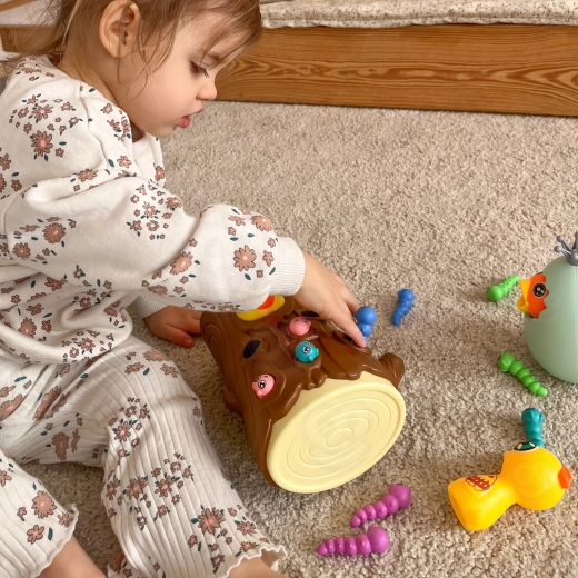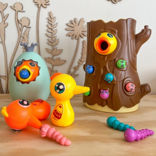 Med magnetiske næb fanger børn orme og fodrer fugleungen. De træner præcision, greb og hånd-øje-koordination på en sjov måde.