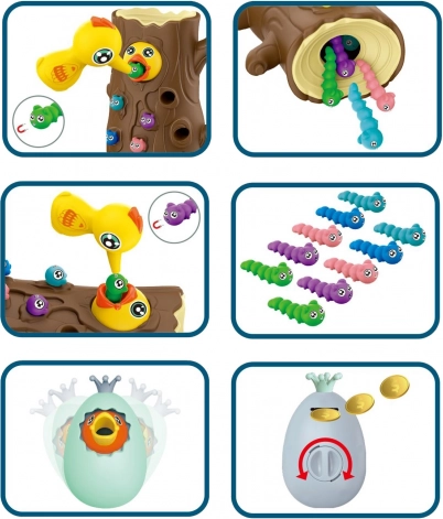 Det sjove magnetiske spil 3-i-1 fra WOOPIE kombinerer læring gennem leg og familiehygge. Børn “fanger” orme med magnetiske næb og fodrer fugleungen i stubben, mens de udvikler finmotorik, hånd-øje-koordination og koncentration. Ægget kan bruges som sparebøsse og tumleæg, spillet er ideelt til to spillere og støtter tålmodighed og præcision.