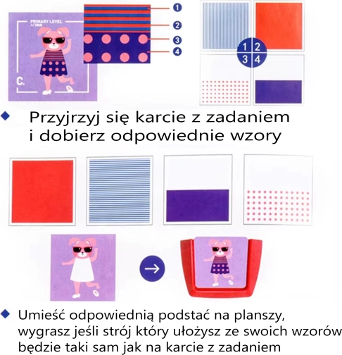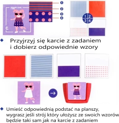 Spillet Woopie Planlæg outfit er et ideelt valg til børn fra 3 år. På standeren lægger børn tøjkortene, så de præcist matcher det givne mønster og farverne på opgavekortet. Takket være klare regler og gradvist stigende sværhedsgrad lærer børn at tænke logisk, planlægge og fokusere, mens de har det sjovt.