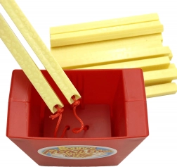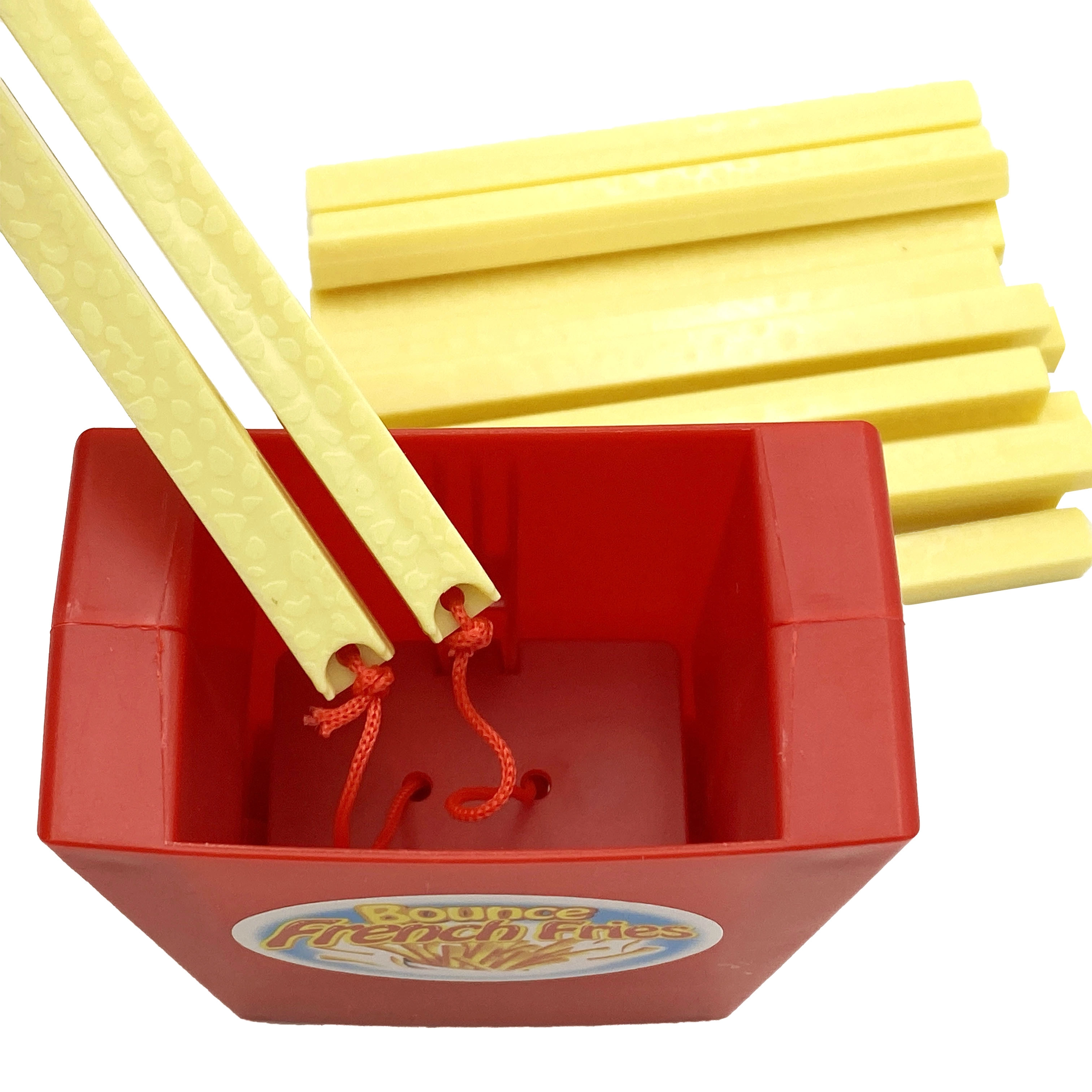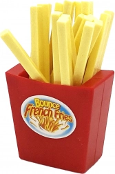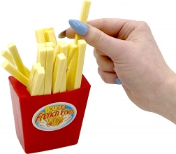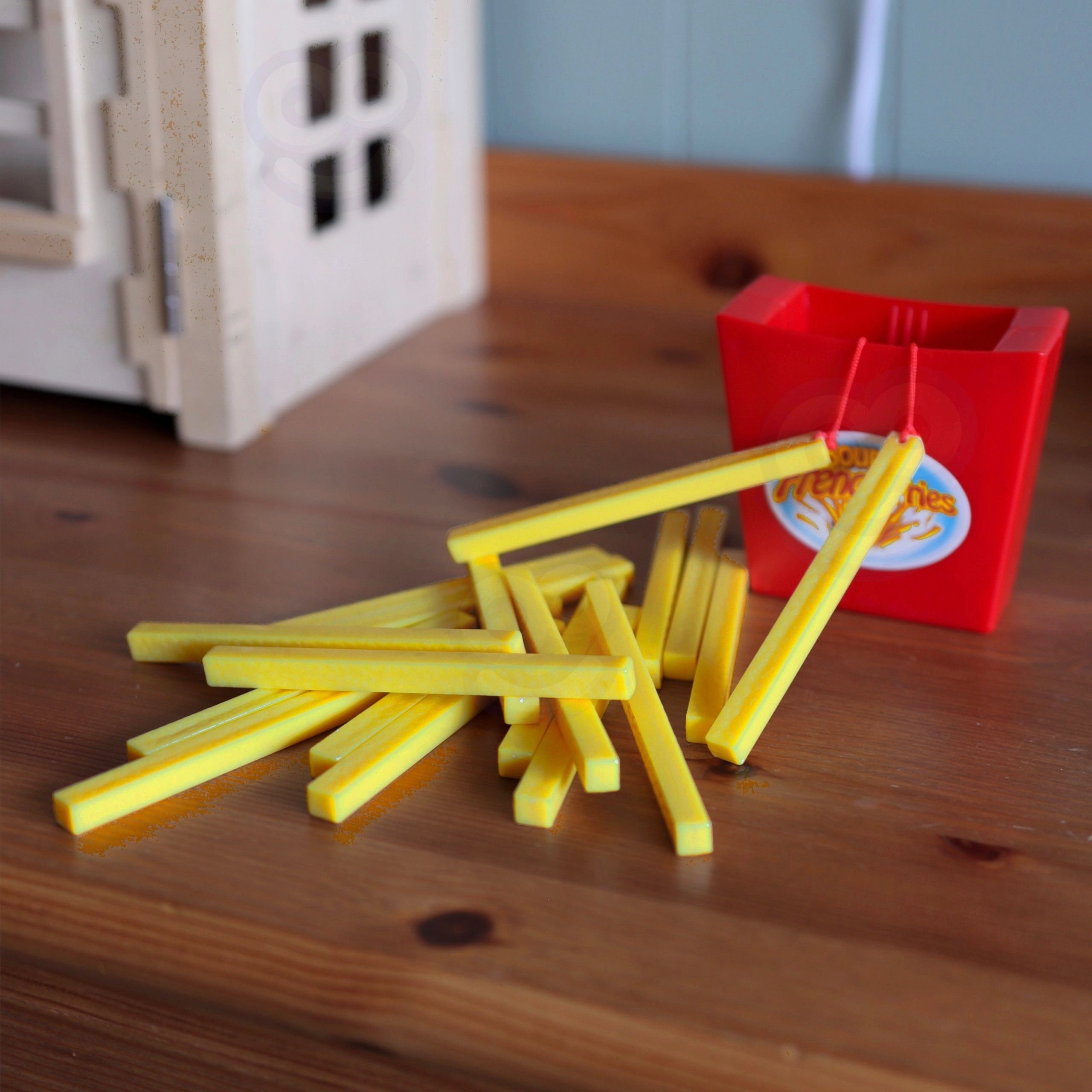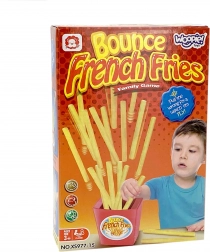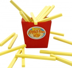 Pakken indeholder: pommes frites‑bæger, sæt fritter (inklusive to “forkerte” fritter, som får alle til at springe).