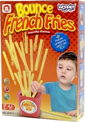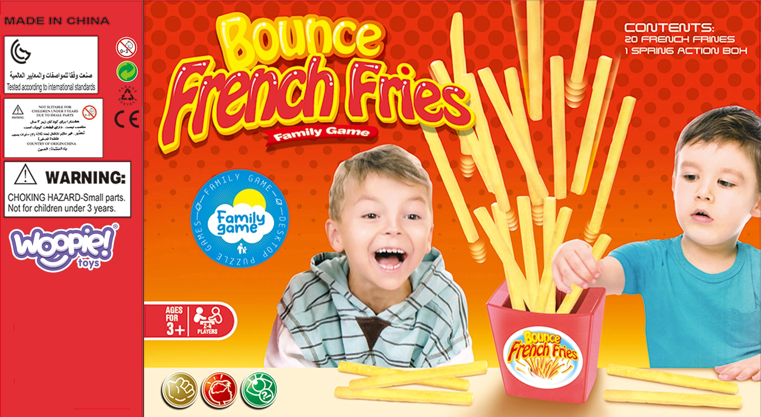 Det sjove familiespil WOOPIE Hoppende pommes frites træner finmotorik og koordination hos børn fra 4 år. Simpelt princip – træk den rigtige frit, så de andre ikke springer op – giver masser af grin og spænding for 2–4 spillere hjemme og på farten.