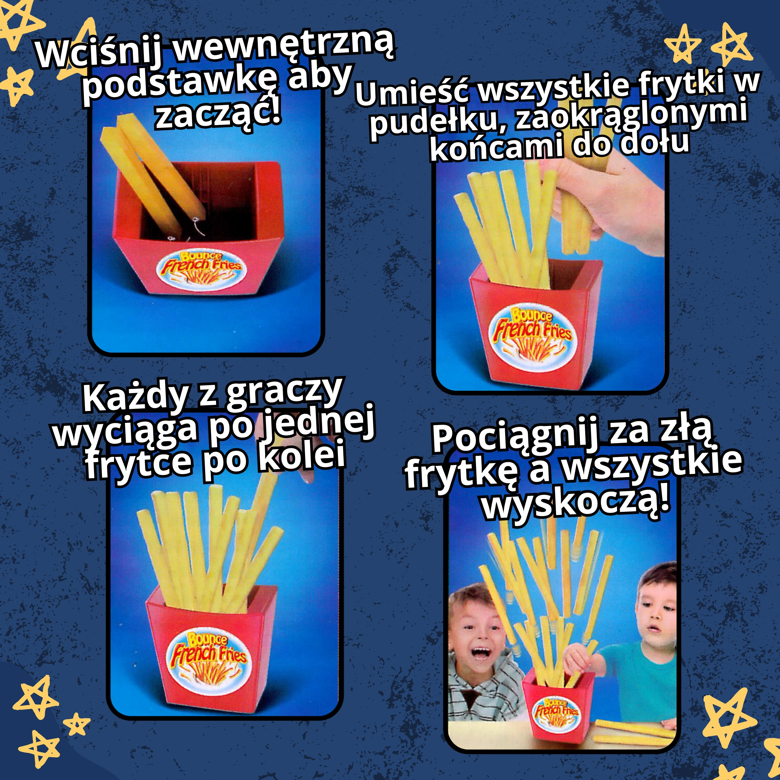 Spillet Hoppende pommes frites fra WOOPIE er et hurtigt og fængende partyspil for både børn og voksne. Målet er forsigtigt at trække fritter ud af bægeret uden at udløse deres “eksplosion”. Let, kompakt og intuitivt – ideelt til hyggelige aftener med familie eller venner.