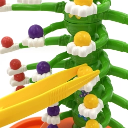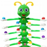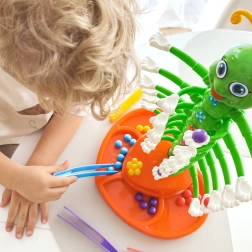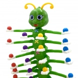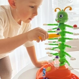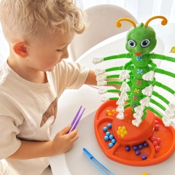 Børn bruger pincetter til præcist at lægge kugler på de bevægelige larvearme, hvilket naturligt styrker hånd-øje-koordination og tålmodighed.