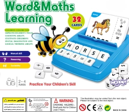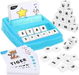 Spillet indeholder en blå plastbakke og hvide blokke til at lære gennem dannelse af ord og matematiske ligninger.