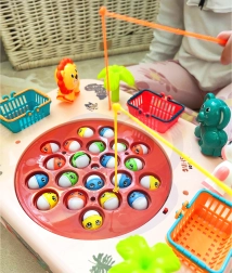 Den bevægelige overflade med farverige fisk øger både sjov og sværhedsgrad. Børn træner reaktionsevne og præcision, når de fanger med fiskestænger.