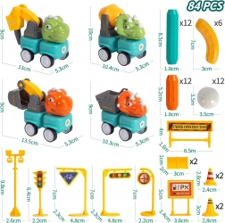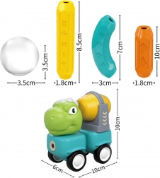12 kugler, 12 lange stænger og 12 korte stænger i fire farver, 4 dinosaurhoveder, 8 hjulrammer, 8 dobbelthjul, 1 trailer, 1 graveskovl, 1 cementblander, 1 bor og andre bildelene