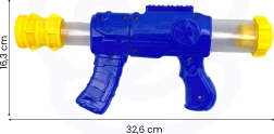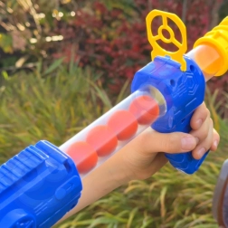 Takket være den luftdrevne pistol er der ikke behov for batterier i pistolen – tryk blot bagenden ind og skyd. Bløde skumkugler er skånsomme og sikre til leg både inde og ude, og anden fungerer også som beholder til nem opbevaring af kuglerne.