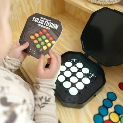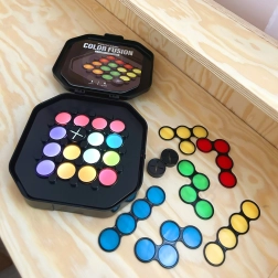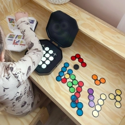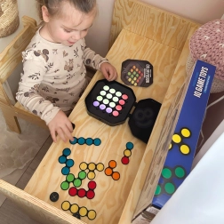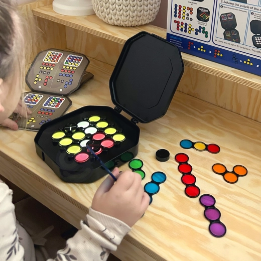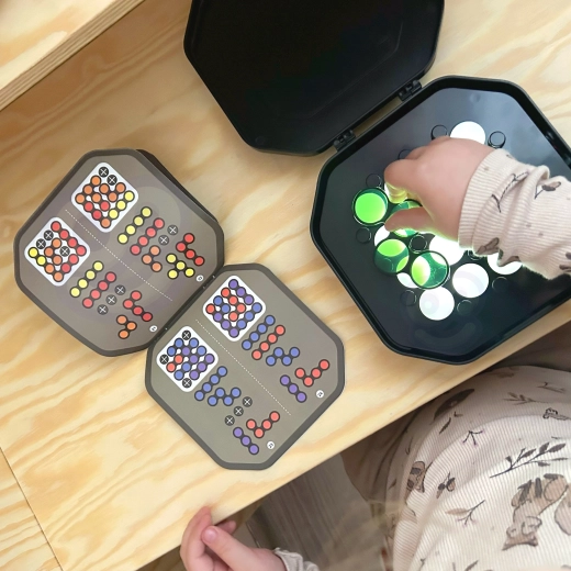 Oplev et smart designet spil, der kombinerer logiske udfordringer med farverig kreativitet. Børn lægger gennemsigtige skiver efter mønsterkortene og ser takket være den bagbelyste plade, hvordan farver lagdeles og blandes. Spillet udvikler naturligt rumlig forestillingsevne, hånd-øje-koordination og lærer at planlægge skridt fremad.