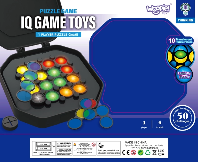 I æsken finder du 50 mønstre fra lette til krævende. Den kompakte og robuste udførelse passer både til børneværelset og i rygsækken på tur. Vælg et kort, tænd for bagbelysningen og begynd at lægge – succesen kommer, når mønsteret på pladen passer præcist til kortet.