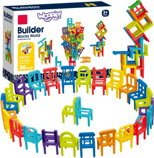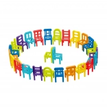 Det sjove sæt indeholder 36 stole i forskellige former og syv farver: blå, lyseblå, orange, gul, grøn, lilla og rød.